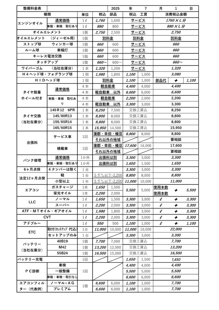 各種整備(主な整備料金表)